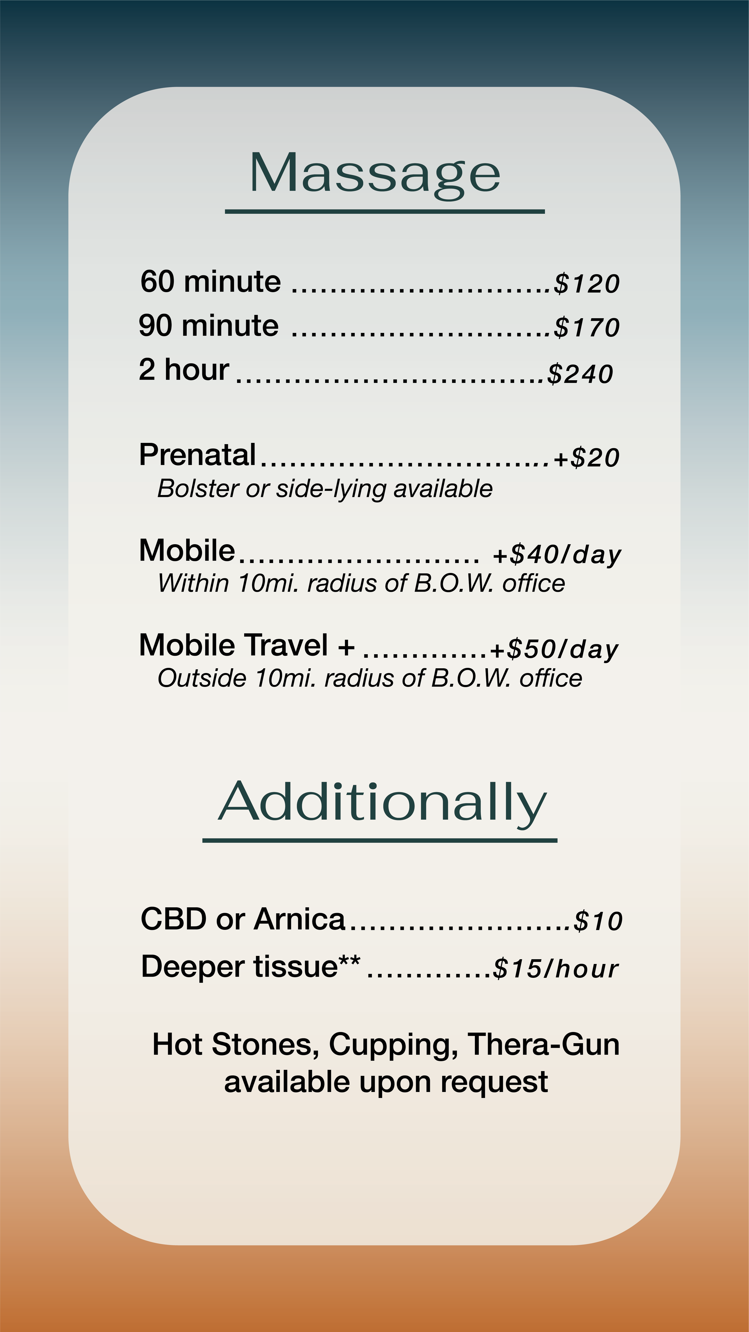 For your mobile massage session I will arrive at our scheduled time, and plan for about 15 minutes to set up and clean up. The length of the massage booked is in reference to hands on time. I need approximately a 6’x9’ area with a power outlet accessible. Respectfully, if you smoke cigarettes in your house I will be unable to offer mobile massage.